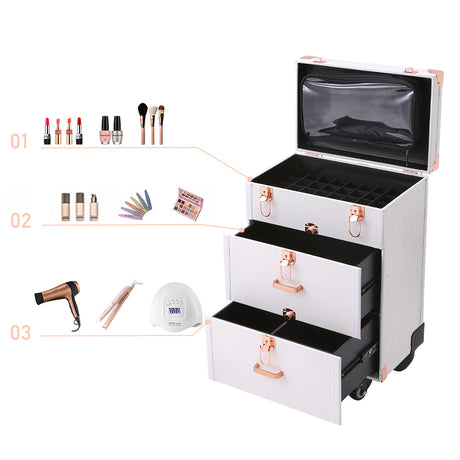 3in1 Cosmetic Trolley Case Beauty case Rolling Makeup Case on Wheels,White
