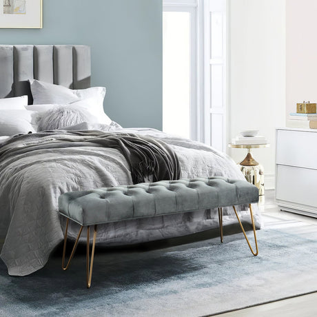 Very low stock (2 units)Sale price £58.99 GBP Regular price £74.99Unit price /UnavailableVelvet Bench with Gold Hairpin Legs Tufted Seat High Density Sponge