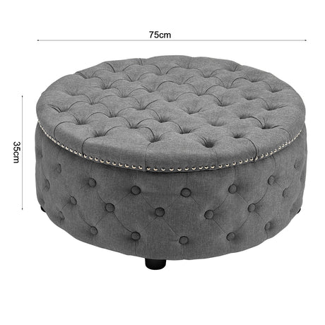 Linen Round Chesterfield Buttoned Footstool studded Edge, Grey White