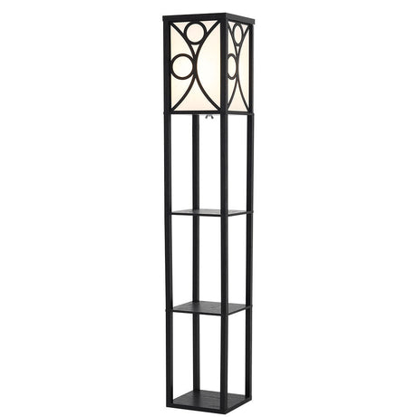 3 in 1 Wooden and Linen Floor Lamp with Shelves,Black Geometric Pattern