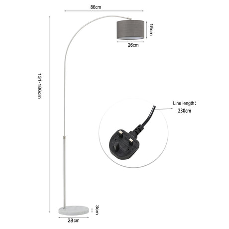 High Adjustable Arched Floor Lamp with Marble Base Cloth Lampshade, Grey