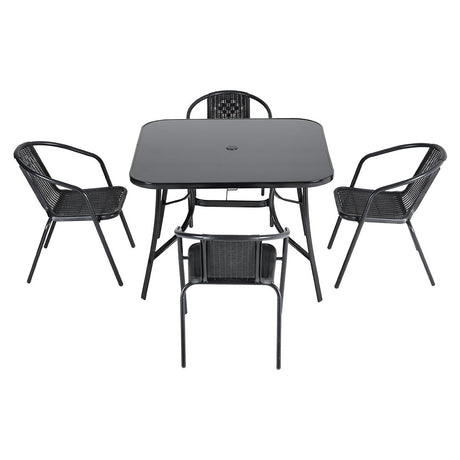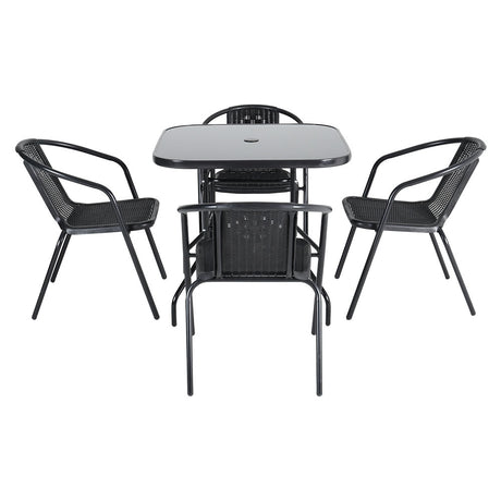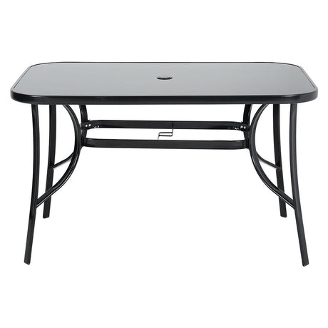 Black Set of 5 Garden 120CM Rectangle Glass Umbrella Table and Stackable Chairs Set