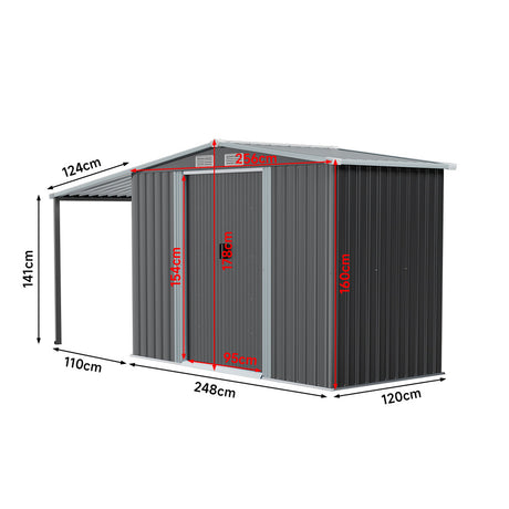Grey 256cm Outdoor Metal Storage Shed with Pitched Roof