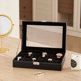 This watch box is simple yet exquisite, and the black faux leather exterior takes most of the credit. The clear glass window on the lid not only keeps your watches from dust but also allows you to admire your proud timepieces without opening the box. It is large enough to fit 12 watches in separate compartments. And each slot comes with a watch pillow to keep the watches in good shape. Made from selected PU, the case adds depth and texture to your watch collection.
