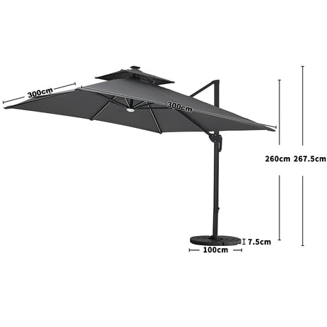 3M Dark Grey Garden LED Light Parasol Outdoor Umbrella with Cross Base