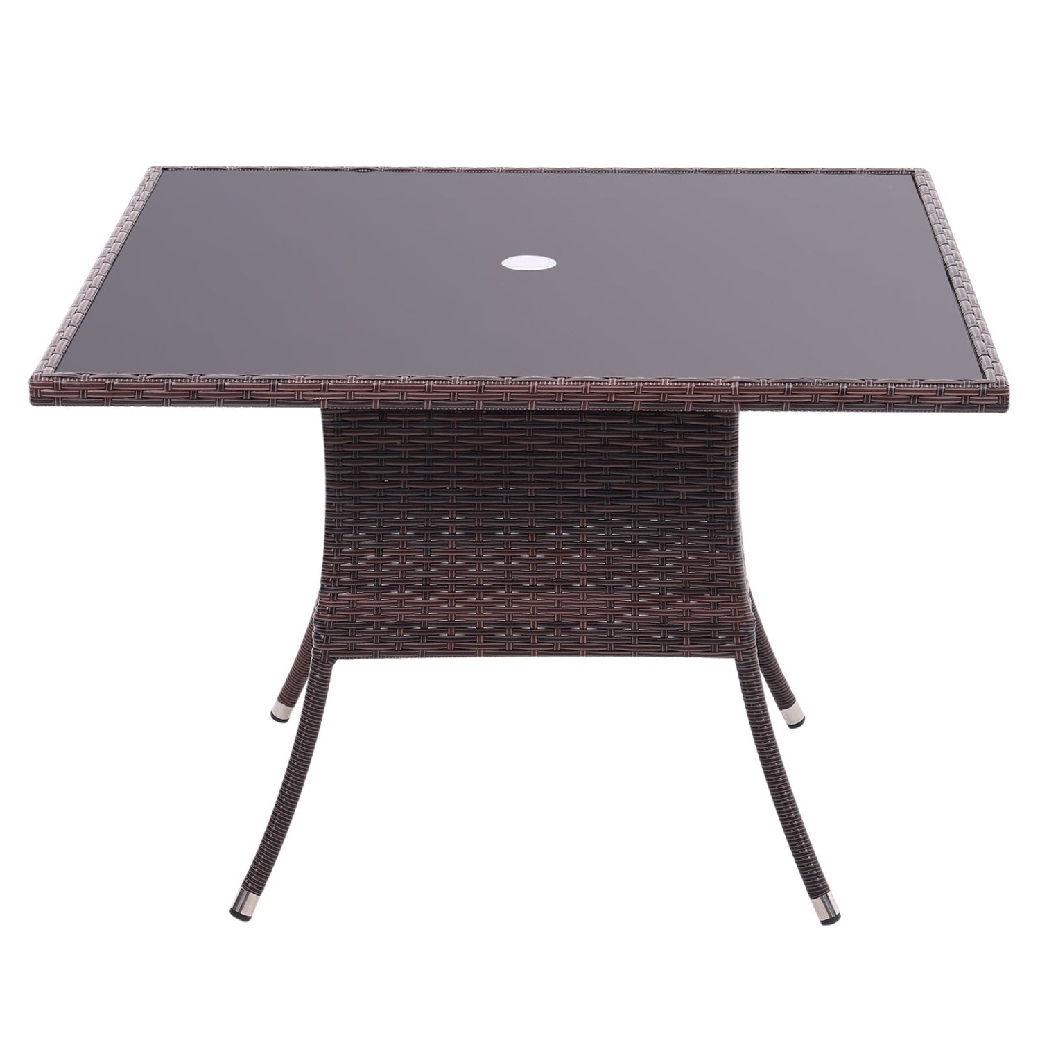 105CM Patio Garden Square Rattan Glass Table With Umbrella Hole Brown