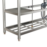 Upgrade your kitchen, restaurant, or bar with the commercial-grade sink, designed to meet the demands of busy food service environments. Crafted from durable stainless steel, it withstands daily use while resisting corrosion, rust, and stains. The large single basin features two tap holes for hot and cold water, accompanied by a drain pipe and backsplash to maintain hygiene and prevent spills. Beneath the basin, double-layer storage shelves offer convenient organization for cleaning tools and catering essentials, ensuring efficiency and functionality in any setting.